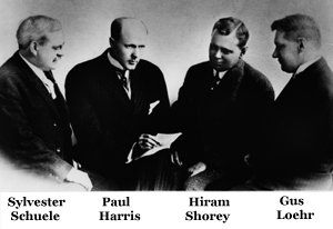 Az alapítók, akiknek köszönhetjük, hogy találkozunk:1905. február 23-án Chicago-ban Paul Harris ügyvéd, Sylvester Schuele szénkereskedő, Hiram Shorey konfekcióárus és Gus Loehr bányamérnök megalapítják a Rotary mozgalmat. |